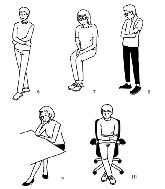 弱势心理者喜欢把身体蜷缩起来,试图占用更小的空间。比如当我们感到不舒服、不安全时,就会产生用手环住脖子的动作。这样做是为了保护我们的脆弱之处,以防被肉食动物咬断颈动脉。类似的行为也发生在动物身上,比如驯服的狗会夹住尾巴。总之,处于弱势心理时,我们会通过各种收敛性的姿势,让自己看起来渺小。
