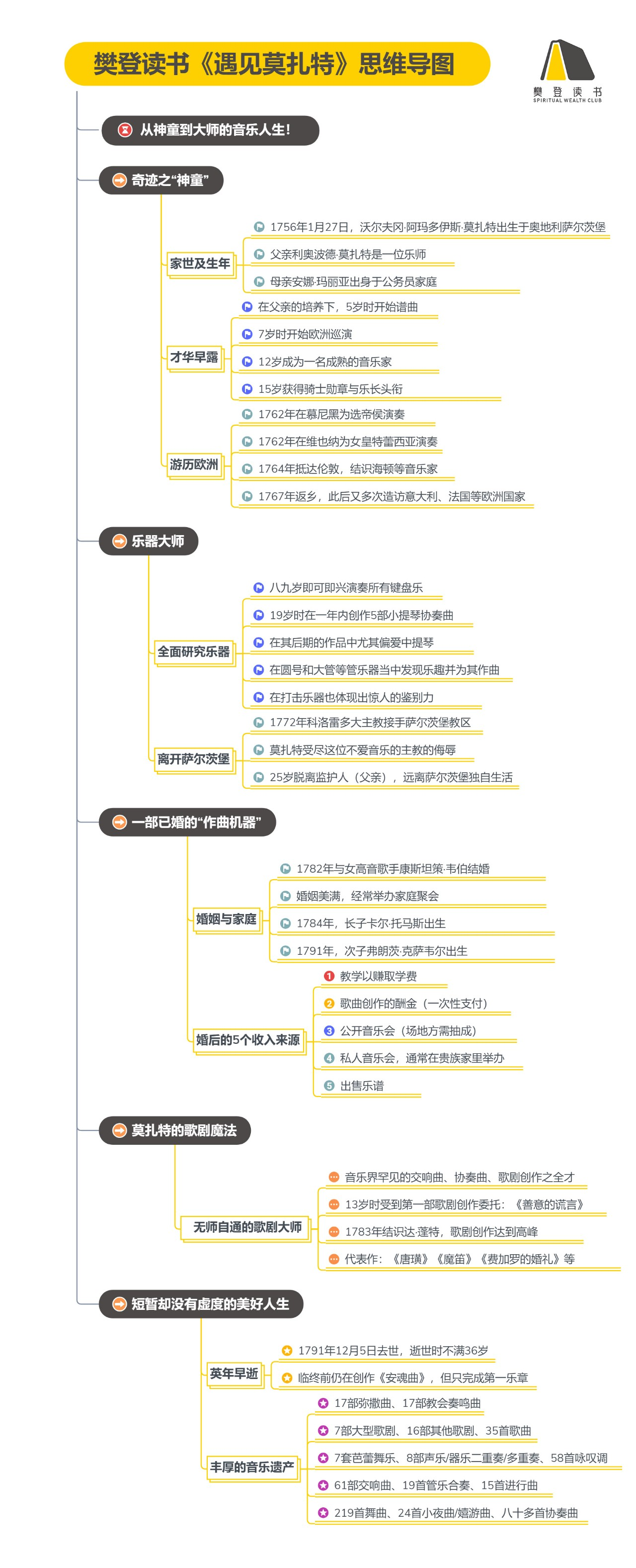 保罗在书中简要梳理了莫扎特的生平,包括作为神童的青少年时期、作为宫廷乐师的萨尔茨堡时期以及作为自由职业音乐家的维也纳时期;他还结合莫扎特音乐作品的主要体裁,包括宗教音乐、室内乐、歌剧、协奏曲和交响曲等,列举了其中的重要作品及他的个人最爱作品。对于一些历史聚讼,保罗也给出了自己的观点,尤其是关于莫扎特的父子关系、夫妻关系以及他的财务状况(包括那些让许多莫扎特热爱者感到难堪的借信)。由丹尼尔·约翰逊撰写的附录则讨论了莫扎特八九岁时在伦敦居留15 个月的经历,并假想了这样一个问题:要是莫扎特当初选择定居伦敦,音乐史又将是怎样一副模样?